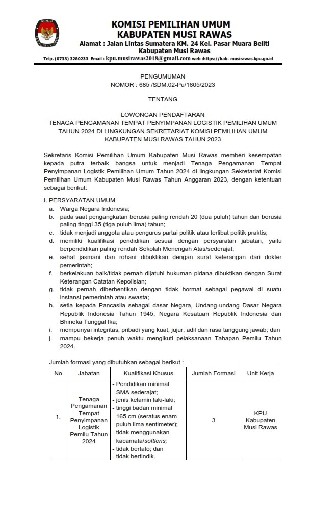 Berikut kami sampaikan lowongan pendaftaran Tenaga Pengamanan Tempat Penyimpanan Logistik pada Pemilihan Umum Tahun 2024 pada Sekretariat KPU Kabupaten Musi Rawas yang dibuka dari tanggal 5 s/d 6 November 2023, untuk informasi lebih lengkap mengenai persyaratan dan tata cara pendaftaran dapat dilihat di link berikut: