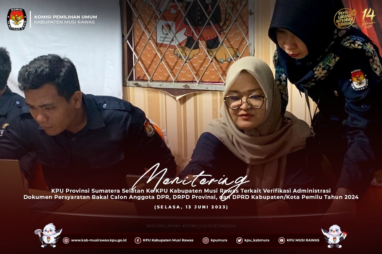 KPU Provinsi Sumatera Selatan melakukan Monitoring Ke KPU Kabupaten Musi Rawas Terkait Verifikasi Administrasi Dokumen Persyaratan Bakal Calon Anggota DPR, DRPD Provinsi, dan DPRD Kabupaten Kota Pemilu Tahun 2024 (13/6/2023) ..