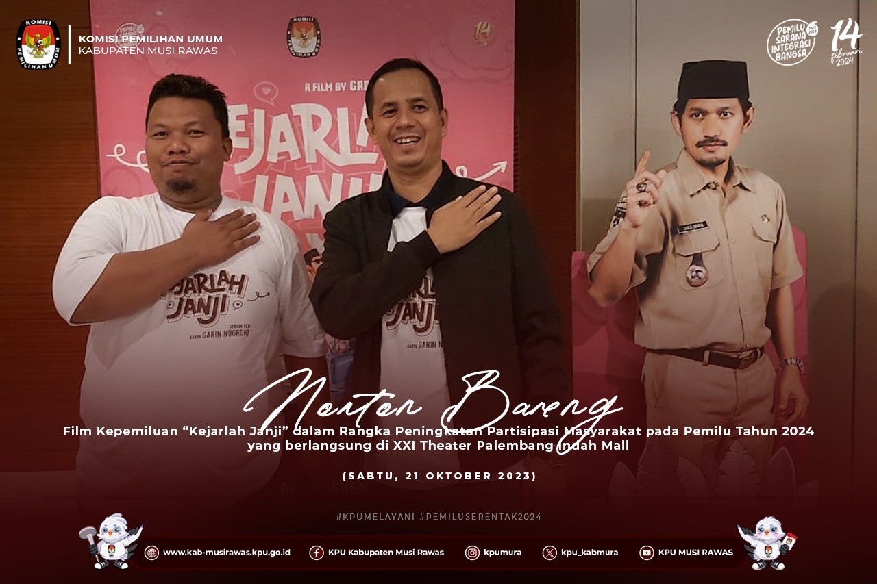 #TemanPemilih, KPU Kabupaten Musi Rawas menghadiri acara Nonton Bareng #film Kepemiluan #KejarlahJanji dalam Rangka Peningkatan Partisipasi Masyarakat pada Pemilu Tahun 2024 yang berlangsung di XXI Theater Palembang Indah Mall (21/10/2023) ..