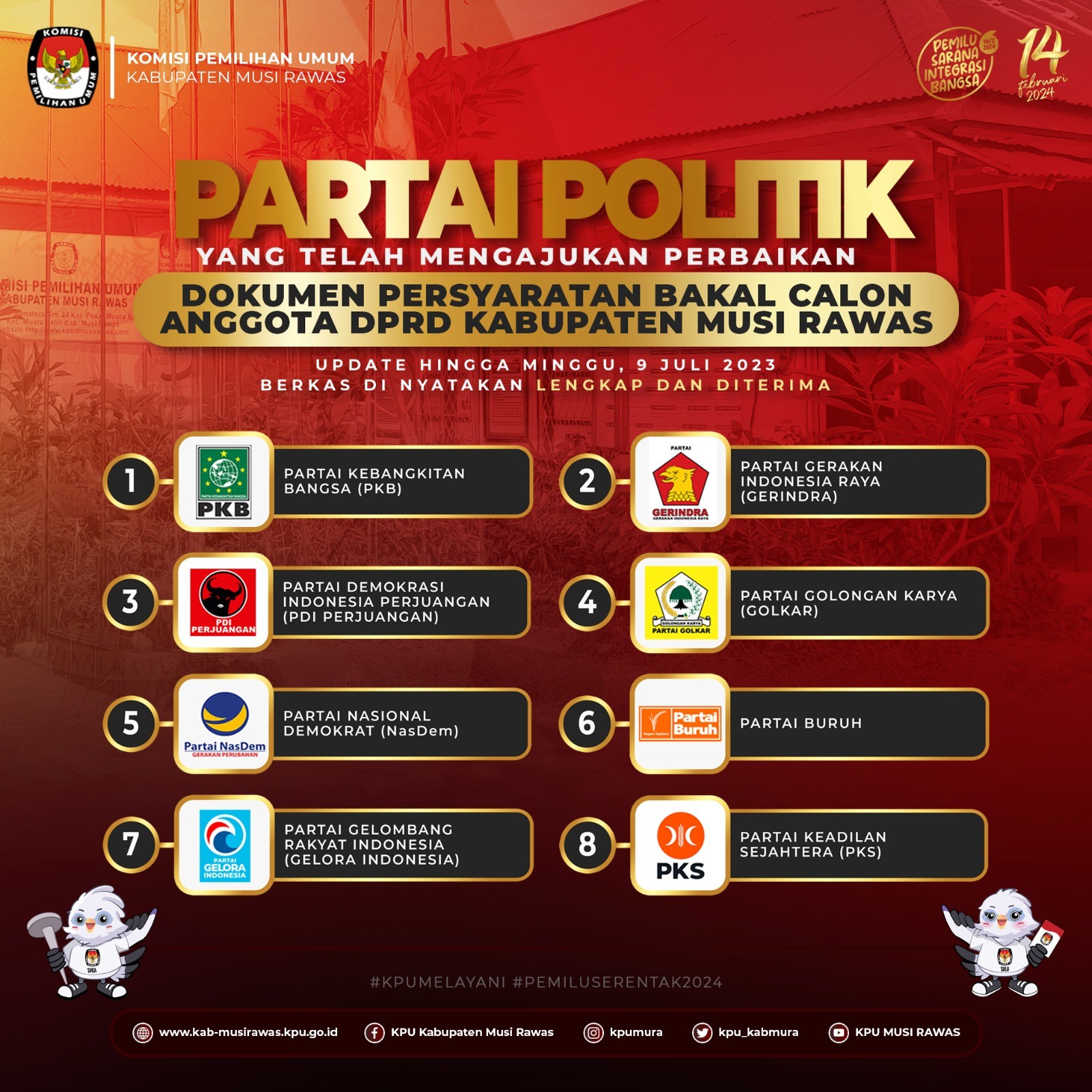 Partai Politik yang Telah Mengajukan Perbaikan Dokumen Bacalon Anggota DPRD Kabupaten Musi Rawas Pemilu 2024