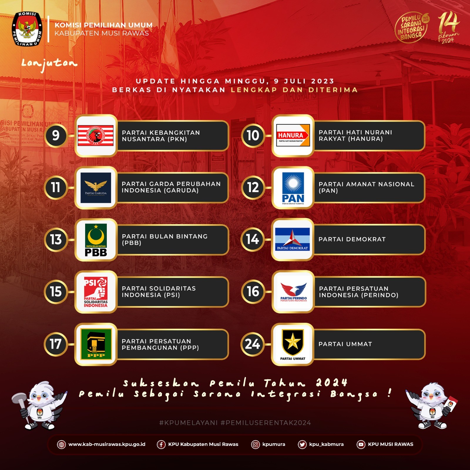 #TemanPemilih, berikut kami informasikan Partai Politik Peserta Pemilu yang telah menyerahkan Perbaikan Dokumen Pengajuan Bakal Calon Anggota Dewan Perwakilan Rakyat Daerah (DPRD) Kabupaten Musi Rawas Pada Pemilu Tahun 2024 ..