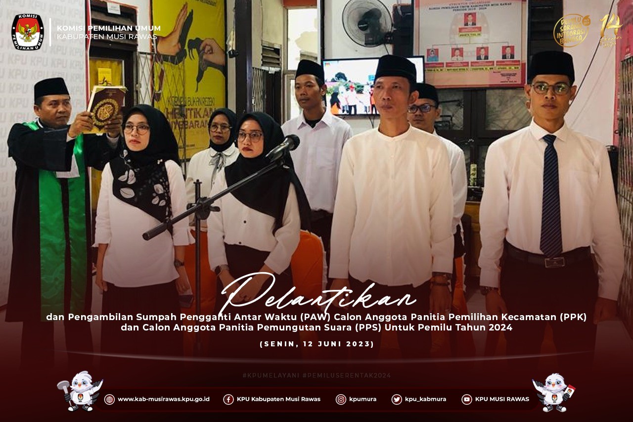 #TemanPemilih, KPU Kabupaten Musi Rawas melaksanakan Kegiatan Pelantikan dan Pengambilan Sumpah Pengganti Antar Waktu (PAW) Calon Anggota Panitia Pemilihan Kecamatan (PPK) dan Calon Anggota Panitia Pemungutan Suara (PPS) Untuk Pemilu Tahun 2024 di Kantor KPU Kabupaten Musi Rawas (12/6/2023) ..