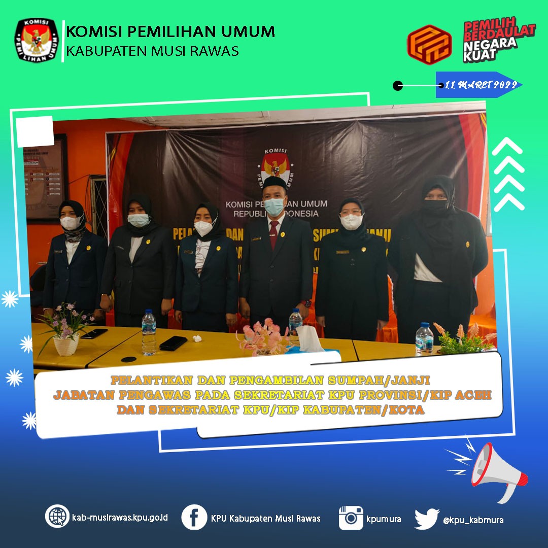 Jumat, 11 Maret 2022, KPU Kabupaten Musi Rawas mengikuti kegiatan "Pelantikan dan Pengucapan Sumpah Janji Jabatan Pengawas pada Sekretariat KPU Provinsi/KIP Aceh dan KPU/KIP Kabupaten Kota" secara daring yang diselenggarakan KPU RI. Acara diikuti oleh seluruh Satuan Kerja KPU di seluruh Indonesia.