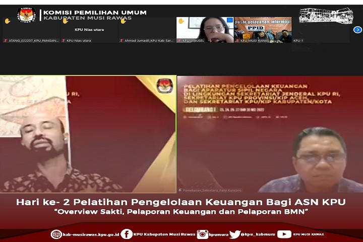 Selasa (24/05), KPU Kab. Musi Rawas mengikuti kegiatan Pelatihan Pengelolaan Keuangan Bagi ASN KPU Hari ke-2. Dimana pada hari ke-2 pelatihan difokuskan pada materi overview aplikasi SAKTI, pelaporan keuangan dan pelaporan BMN. Kegiatan ini diikuti oleh Sekretaris KPU Kabupaten Musi Rawas selaku KPA, PPK, PPSPM, Bendahara Pengeluaran dan Staf Keuangan KPU Kabupaten Musi Rawas.
