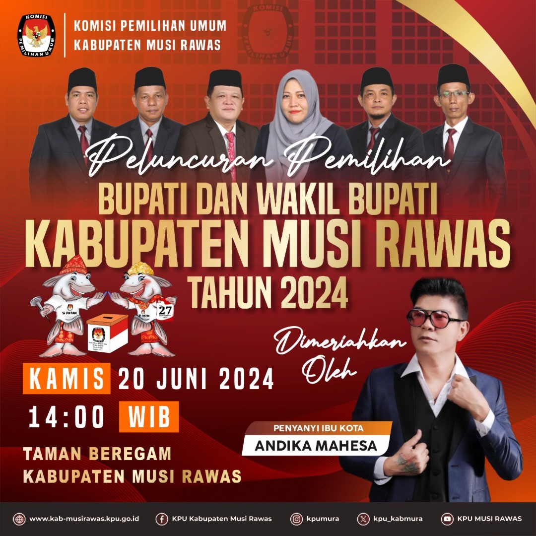 #TemanPemilih, Mari saksikan bersama Peluncuran/Launching Pemilihan Bupati dan Wakil Bupati Musi Rawas Tahun 2024 yang di meriahkan oleh artis Ibu Kota, Andika Mahesa yang akan selenggarakan pada hari Kamis tanggal 20 Juni 2024 di Taman Beregam Kecamatan Muara Beliti..