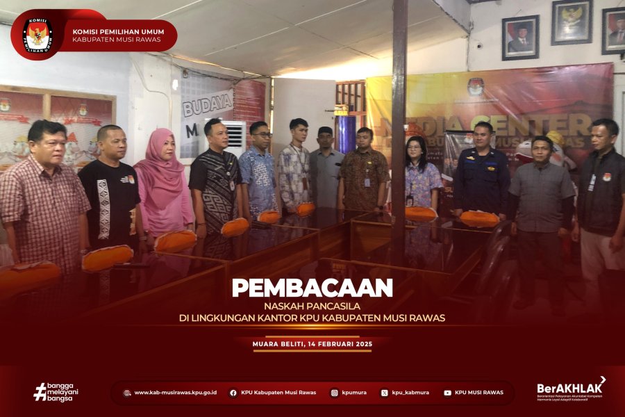 #TemanPemilih, Menindaklanjuti Surat Kementeriaan Sekretariat Negara Republik Indonesia Nomor : B-32/KSN/TU.00/01/2025 dan Surat KPU Republik Indonesia Nomor : 350/PK.02-SD/03/2025 Perihal Pemberitahuan Untuk Memperdengarkan Lagu Kebangsaan Indonesia Raya dan Naskah lainnya, Komisioner dan Sekretariat KPU Kabupaten Musi Rawas melakukan pembacaan naskah Pancasila di Kantor KPU Kabupaten Musi Rawas (14/2/2025) ..