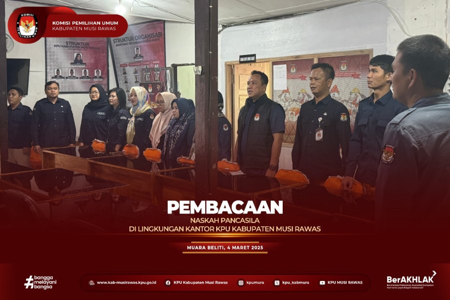 #TemanPemilih, Menindaklanjuti Surat Kementeriaan Sekretariat Negara Republik Indonesia Nomor : B-32/KSN/TU.00/01/2025 dan Surat KPU Republik Indonesia Nomor : 350/PK.02-SD/03/2025 Perihal Pemberitahuan Untuk Memperdengarkan Lagu Kebangsaan Indonesia Raya dan Naskah lainnya, Komisioner dan Sekretariat KPU Kabupaten Musi Rawas melakukan pembacaan naskah Pancasila di Kantor KPU Kabupaten Musi Rawas (4/3/2025) ..