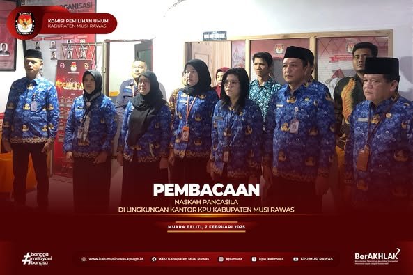 #TemanPemilih, Menindaklanjuti Surat Kementeriaan Sekretariat Negara Republik Indonesia Nomor : B-32/KSN/TU.00/01/2025 dan Surat KPU Republik Indonesia Nomor : 350/PK.02-SD/03/2025 Perihal Pemberitahuan Untuk Memperdengarkan Lagu Kebangsaan Indonesia Raya dan Naskah lainnya, Komisioner dan Sekretariat KPU Kabupaten Musi Rawas melakukan pembacaan naskah Pancasila di Kantor KPU Kabupaten Musi Rawas (7/2/2025) ..