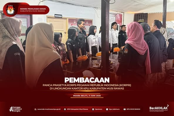 #TemanPemilih, Menindaklanjuti Surat Kementeriaan Sekretariat Negara Republik Indonesia Nomor : B-32/KSN/TU.00/01/2025 dan Surat KPU Republik Indonesia Nomor : 350/PK.02-SD/03/2025 Perihal Pemberitahuan Untuk Memperdengarkan Lagu Kebangsaan Indonesia Raya dan Naskah lainnya, Komisioner dan Sekretariat KPU Kabupaten Musi Rawas melakukan pembacaan Panca Prasetya KORPRI di Kantor KPU Kabupaten Musi Rawas (11/6/2025) ..