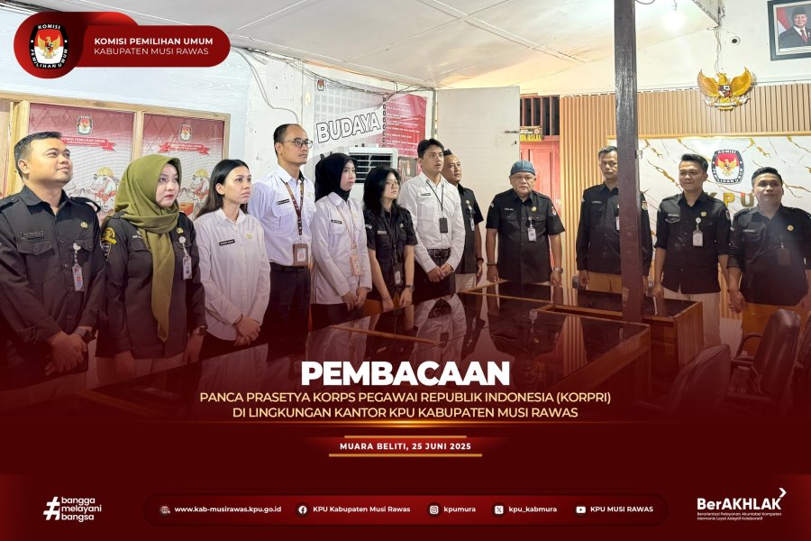 #TemanPemilih, Menindaklanjuti Surat Kementeriaan Sekretariat Negara Republik Indonesia Nomor : B-32/KSN/TU.00/01/2025 dan Surat KPU Republik Indonesia Nomor : 350/PK.02-SD/03/2025 Perihal Pemberitahuan Untuk Memperdengarkan Lagu Kebangsaan Indonesia Raya dan Naskah lainnya, Komisioner dan Sekretariat KPU Kabupaten Musi Rawas melakukan pembacaan Panca Prasetya KORPRI di Kantor KPU Kabupaten Musi Rawas (25/6/2025) ..