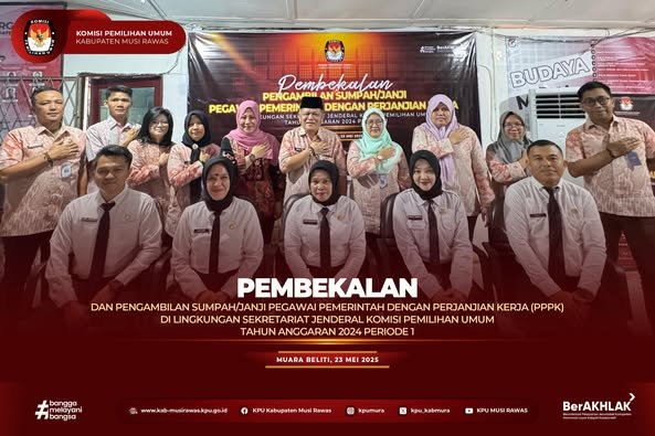 #TemanPemilih, Komisioner dan Pejabat di Sekretariat KPU Kabupaten Musi Rawas menghadiri acara Pembekalan dan Pengambilan Sumpah/Janji Pegawai Pemerintah dengan Perjanjian Kerja (PPPK) Sekretariat Jenderal Komisi Pemilihan Umum Tahun Anggaran 2024 Periode 1 secara daring di Kantor KPU Kabupaten Musi Rawas (23/5/2025) ..