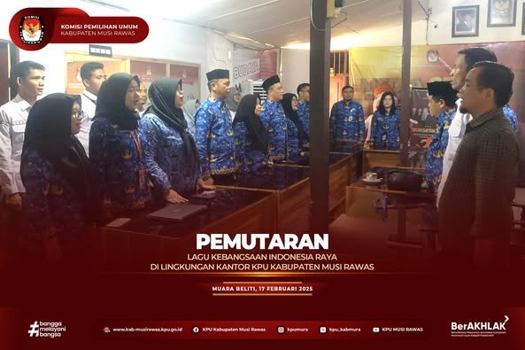 #TemanPemilih, Menindaklanjuti Surat Kementeriaan Sekretariat Negara Republik Indonesia Nomor : B-32/KSN/TU.00/01/2025 dan Surat KPU Republik Indonesia Nomor : 350/PK.02-SD/03/2025 Perihal Pemberitahuan Untuk Memperdengarkan Lagu Kebangsaan Indonesia Raya dan Naskah lainnya, Komisioner dan Sekretariat KPU Kabupaten Musi Rawas melakukan pemutaran lagu Kebangsaan Indonesia Raya di Kantor KPU Kabupaten Musi Rawas (17/2/2025) ..