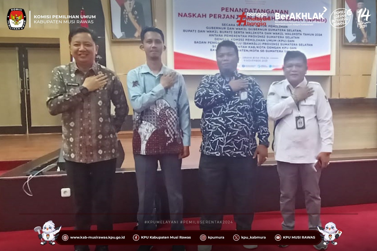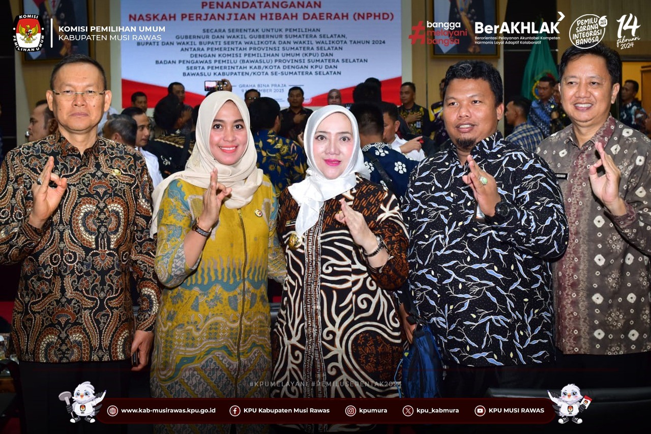 #TemanPemilih, KPU Kabupaten Musi Rawas Menghadiri Kegiatan Penandatanganan Naskah Perjanjian Hibah Daerah (NPHD) Secara Serentak Untuk Pemilihan Kepala Daerah Tahun 2024 Antara Pemerintah Se-Provinsi Sumatera Selatan dengan KPU dan Bawaslu Se-Provinsi Sumatera Selaatan yang berlangsung di Kota Palembang (9/11/2023) ..