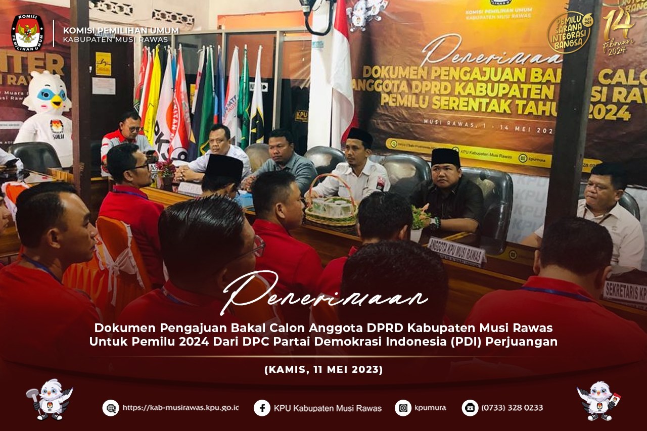 #TemanPemilih, KPU Kabupaten Musi Rawas menerima kehadiran Pengurus DPC Partai Demokrasi Indonesia (PDI) Perjuangan di Kantor KPU Kabupaten Musi Rawas terkait penerimaan berkas Bakal Calon Anggota Dewan Perwakilan Rakyat Daerah (DPRD) Kabupaten Musi Rawas Untuk Pemilihan Umum Tahun 2024 (11/5/2023) . ..