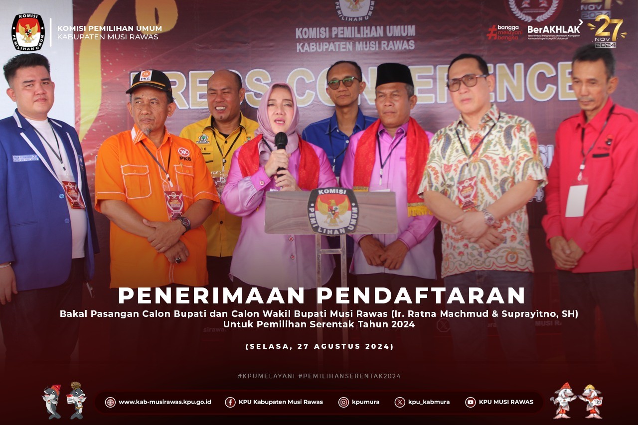 #TemanPemilih, KPU Kabupaten Musi Rawas Menerima Pendaftaran Bakal Pasangan Calon Bupati dan Calon Wakil Bupati Musi Rawas Pada Pemilihan Serentak Tahun 2024 atas nama Ir. Ratna Machmud dan Suprayitno, SH yang bertempat di Kantor KPU Kabupaten Musi Rawas (27/8/2024)