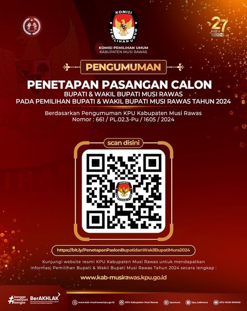 silahkan scan barcode yang tertera atau kunjungi website resmi KPU Kabupaten Musi Rawas untuk mengunduh Pengumuman yang dimaksud ..