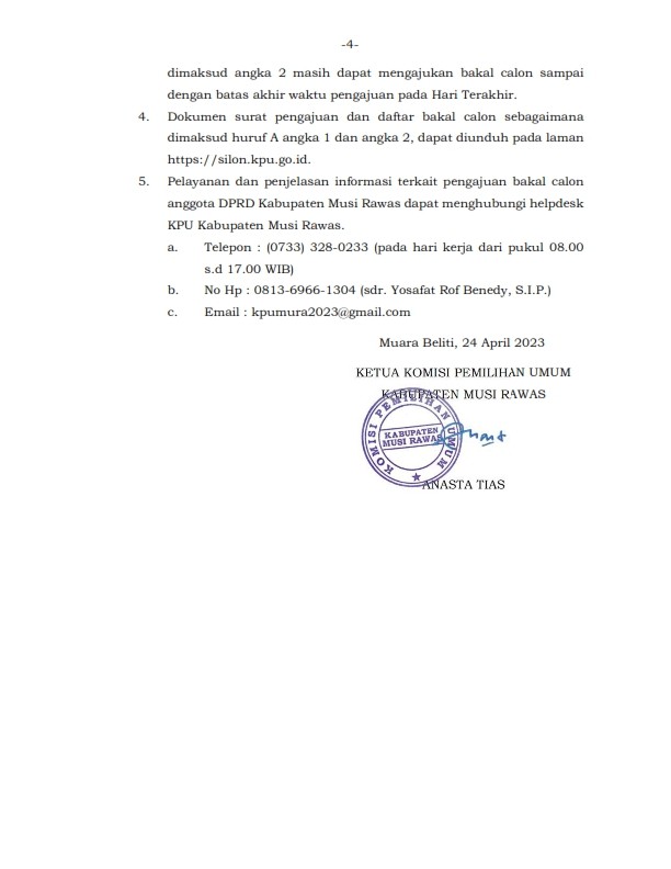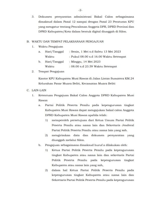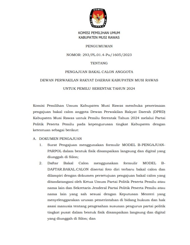 Berikut kami informasikan bahwa tahapan pencalonan anggota DPR, DPRD Provinsi dan DPRD Kabupaten/Kota yang sebentar lagi akan dimulai, diawali dengan tahap Pengajuan Bakal Calon Anggota DPR, DPRD Provinsi dan DPRD Kabupaten/Kota pada tanggal 1 s/d 14 Mei 2023 oleh Partai Politik Peserta Pemilu Tahun 2024. Untuk di wilayah Kabupaten Musi Rawas, pengajuan bakal calon anggota DPRD Kabupaten Musi Rawas juga dilaksanakan pada masa waktu yang telah disebutkan. Silahkan dibaca dengan seksama Untuk informasi lebih jelas dan lengkapnya. Apabila ada pertanyaan dapat langsung menghubungi contact person kami di nomor 0813-6966-1304 (sdr. Yosafat Rof Benedy,S.I.P.)