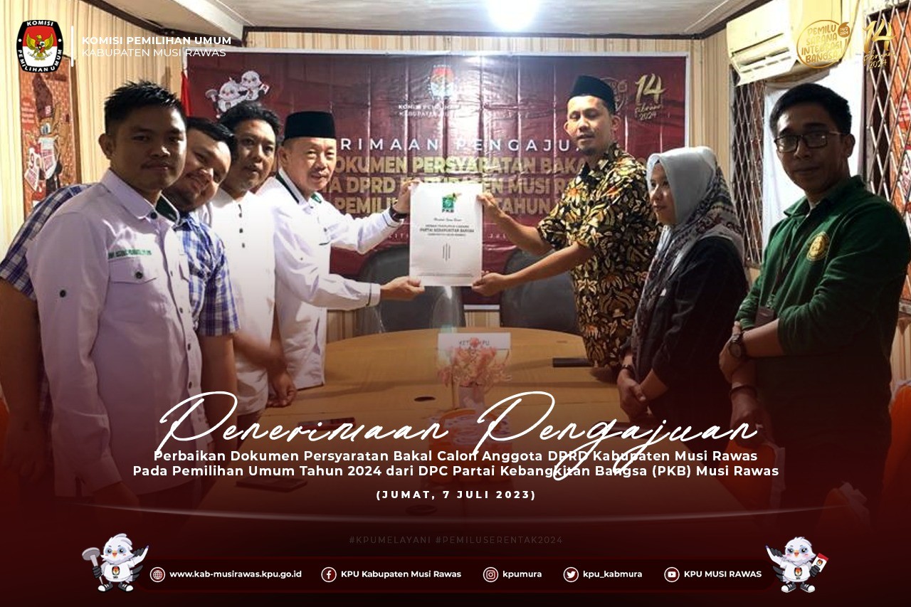 #TemanPemilih, KPU Kabupaten Musi Rawas Menerima Pengajuan Perbaikan Dokumen Persyaratan Bakal Calon Anggota DPRD Kabupaten Musi Rawas Pada Pemilihan Umum Tahun 2024 yang di serahkan oleh DPC Partai Kebangkitan Bangsa (PKB) di Kantor KPU Kabupaten Musi Rawas (7/7/2023) ..