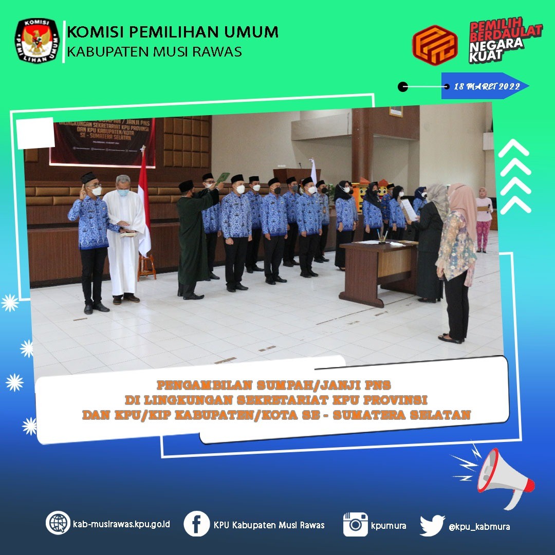 Jumat (18/03), KPU Kabupaten Musi Rawas mengikuti "Pengambilan Sumpah/Janji PNS di Lingkungan Sekretariat KPU Provinsi dan KPU/KIP Kabupaten/Kota Se-Sumsel, diikuti oleh 48 orang PNS dimana terdapat 4 orang PNS dari KPU Kabupaten Musi Rawas..