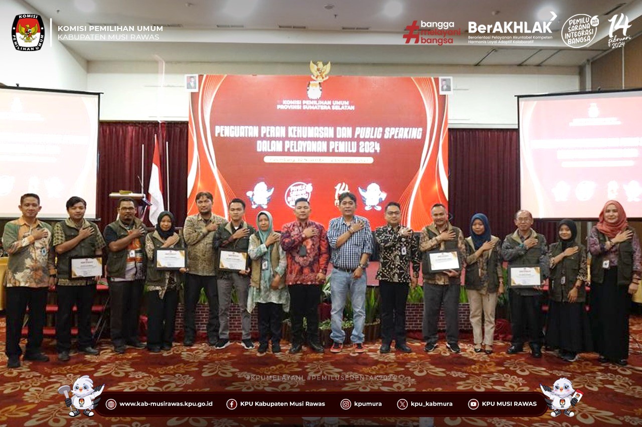 Kegiatan tersebut ditutup langsung oleh Anggota KPU Sumsel Divisi Sosdiklih, Parmas dan SDM, Bapak Rudiyanto Pangaribuan dengan mengumumkan anugerah kehumasan Tahun 2023 kepada KPU Kabupaten/Kota dalam beberapa kategori, yakni kategori media sosial ter-update diberikan kepada KPU Kabupaten Empat Lawang dan Kabupaten Lahat. Kategori media sosial terbaik satu, KPU kabuaten Musi Rawas, terbaik kedua, KPU Kota Prabumulih, terbaik ketiga, KPU Kota Palembang (30 Nov - 2 Des 2023) ..