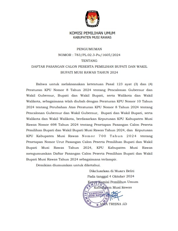 #TemanPemilih, berikut kami sampaikan Daftar Pasangan Calon (DPC) Bupati dan Wakil bupati Musi Rawas pada Tahun 2024....