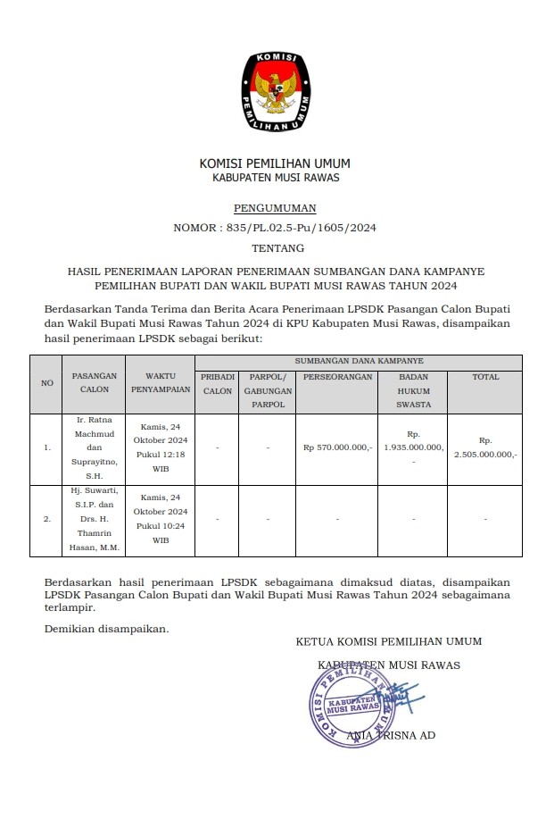 Berikut kami infokan pengumuman penerimaan Laporan Penerimaan Sumbangan Dana Kampanye (LPSDK) Pasangan Calon Bupati dan Wakil Bupati Musi Rawas Tahun 2024 :