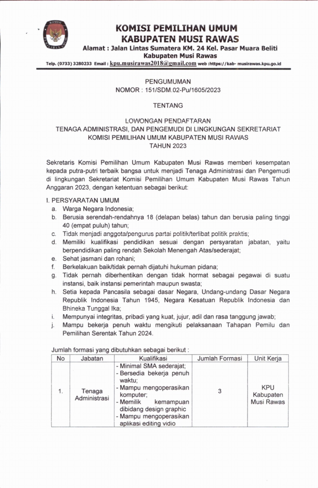 Pengumuman Lowongan Pendaftaran Tenaga Administrasi dan Pengemudi di Lingkungan Sekretariat KPU Kabupaten Musi Rawas Tahun 2023