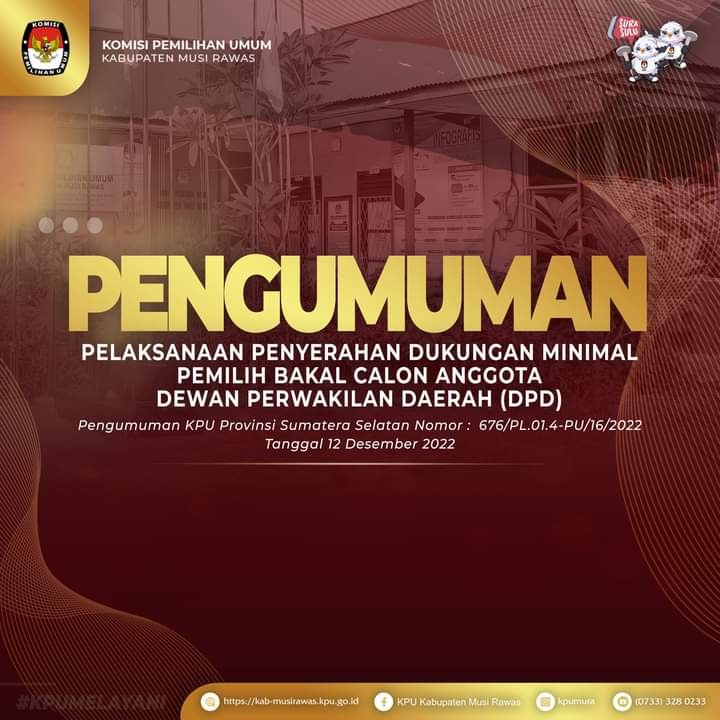 Berikut kami sampaikan Pengumuman KPU Provinsi Selatan Nomor : 676 /PL.01.4-PU/16/2022 Tentang Pelaksanaan Penyerahan Dukungan Minimal Pemilih Bakal Calon Anggota Dewan Perwakilan Daerah terkait jumlah minimal dukungan pemilih, tempat dan waktu pelaksanaan penyerahan dukungan minimal pemilih bakal calon anggota Dewan Perwakilan Daerah Tahun 2024 Provinsi Sumatera Selatan. Dibaca dan disimak dengan seksama ya di bawah ini...
