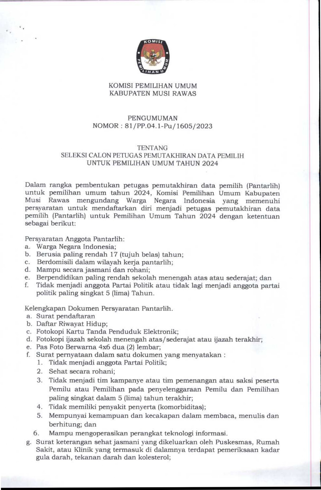 Dalam rangka pembentukan petugas pemutakhiran data pemilih (Pantarlih) untuk Pemilihan Umum Tahun 2024, Komisi Pemilihan Umum Kabupaten Musi Rawas mengundang Warga Negara Indonesia yang memenuhi persyaratan untuk mendaftarkan diri dengan ketentuan dan persyaratan yang dapat dilihat di bawah ini ....