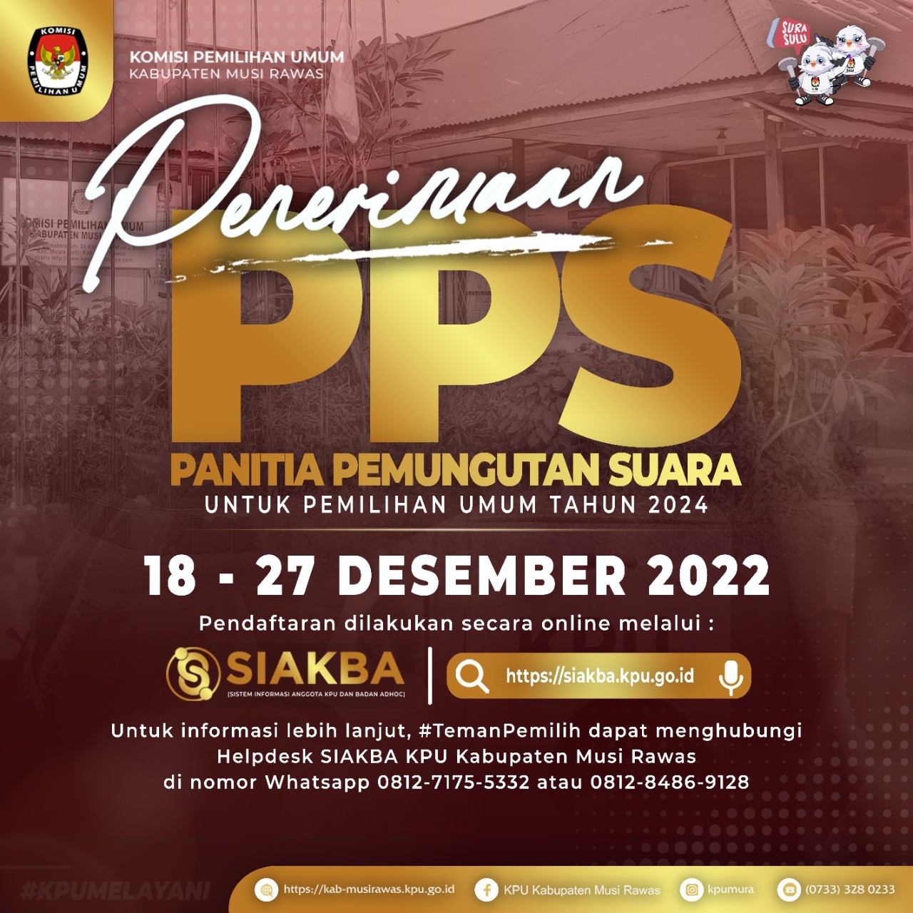Setelah tahapan Penerimaan Panitia Pemilihan Kecamatan (PPK) di Kabupaten Musi Rawas selesaI, KPU Kabupaten Musi Rawas kembali membuka pendaftaran untuk penerimaaan calon Panita Pemungutan Suara sebagaimana tertuang dalam Pengumuman KPU Kabupaten Musi Rawas nomor : 331/PP.04-Pu/1605/2022 tanggal 18 Desember 2022 perihal " Seleksi Calon Anggota Panita Pemungutan Suara Untuk Pemilihan Umum Tahun 2024". Yuk dilihat dan disimak apa saja ketentuan dan persyaratannya di link berikut :