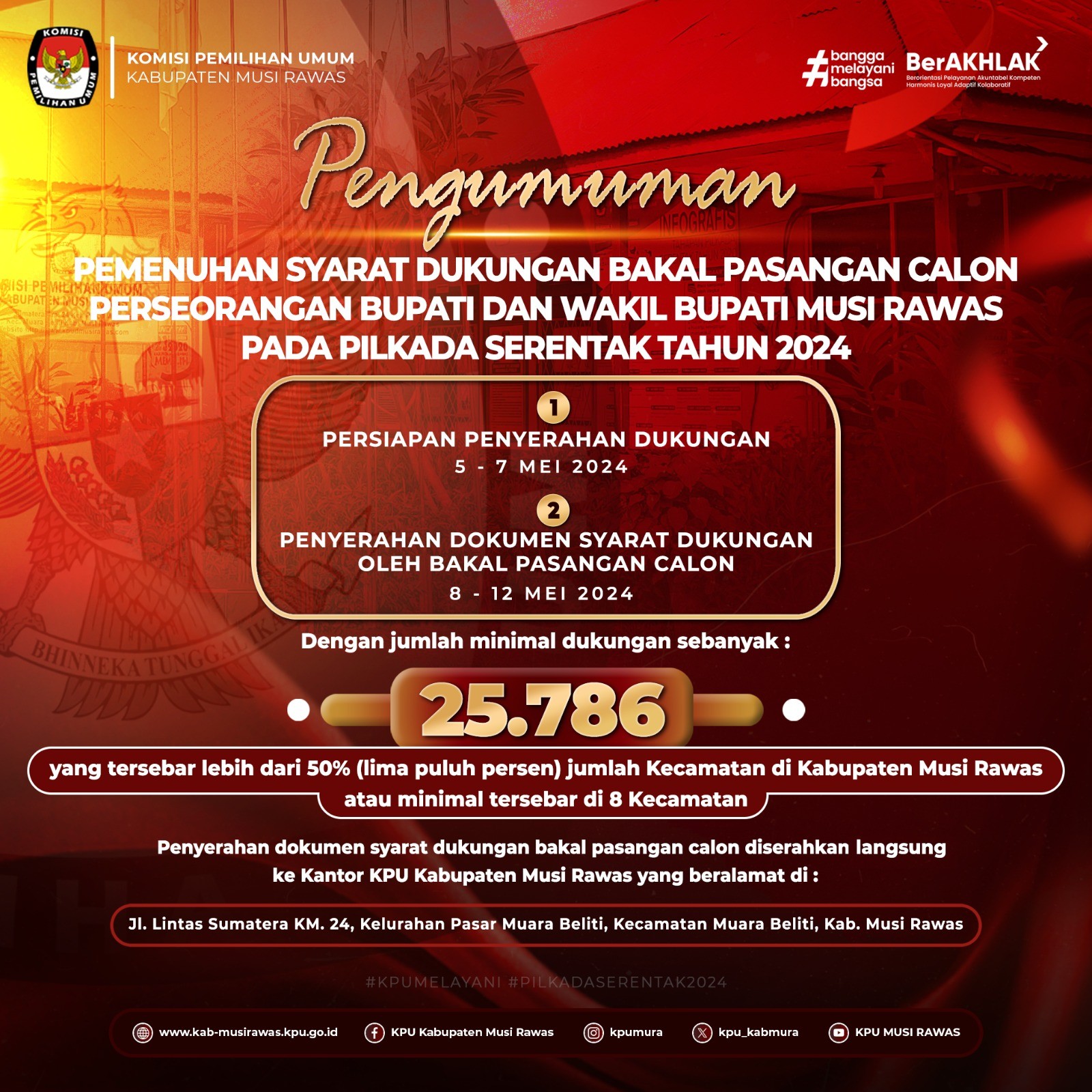 #TemanPemilih, KPU Kabupaten Musi Rawas menerima penyerahan dokumen persyaratan dukungan bakal pasangan calon perseorangan dalam Pemilihan Bupati dan Wakil Bupati Musi Rawas Tahun 2024 mulai dari hari Rabu tanggal 8 Mei 2024 s.d Minggu tanggal 12 Mei 2024 dengan ketentuan dan persyaratan yang dapat diunduh dan dilihat secara lengkap disini dan untuk dokumen persyaratan yang dibutuhkan dapat diunduh disini. Bagi bakal pasangan calon perseorangan agar menyampaikan surat pemberitahuan yang memuat jadwal rencana penyerahan dukungan bakal pasangan calon perseorangan yang dapat dikirimkan melalui https://bit.ly/JadwalPenyerahanDukunganAwalKD.