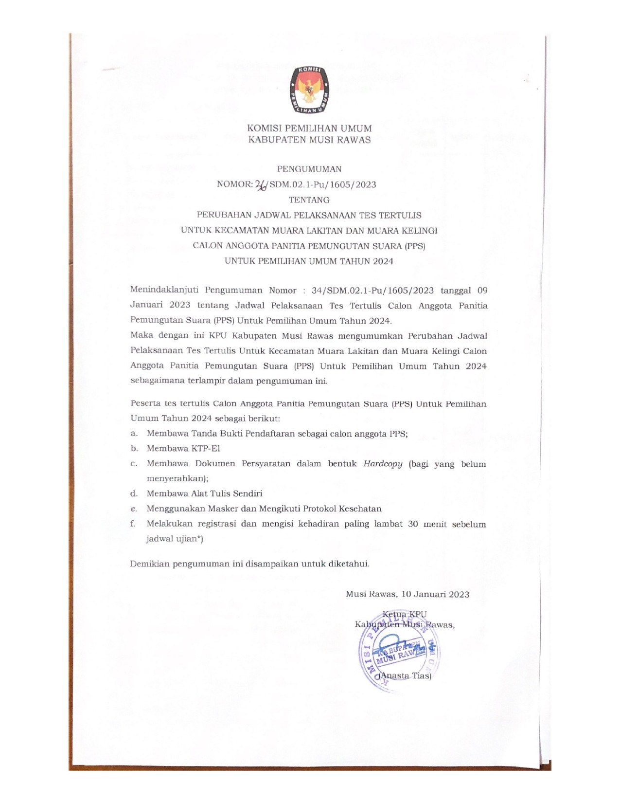 Berikut kami sampaikan perubahan jadwal ujian CAT PPS untuk Pemilu Tahun 2024 (nama dan kecamatan terlampir), selengkapnya dapat dilihat di link berikut :