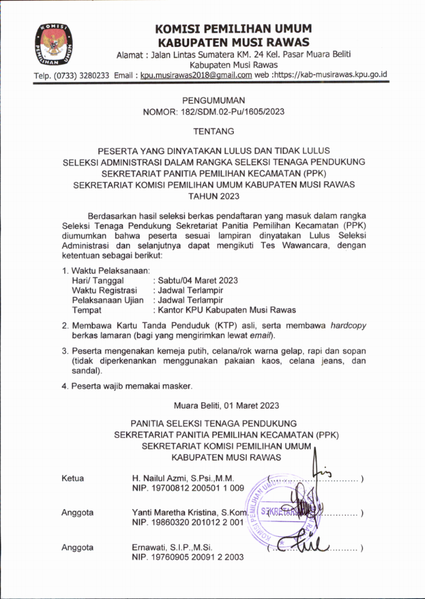 Berikut kami sampaikan hasil seleksi administrasi dalam rangka seleksi tenaga pendukung Sekretariat Panita Pemilihan Kecamatan (PPK) Kabupaten Musi Rawas Tahun 2023 berdasarkan pendaftaran yang telah dibuka dari tanggal 24 s/d 27 Februari 2023 pukul 16.00 WIB. Untuk hasil lengkapnya dapat dilihat di link di bawah ini :