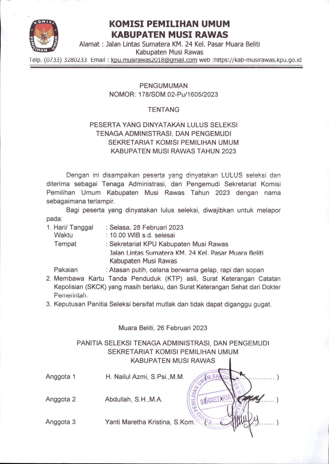 Pengumuman Peserta yang lulus Seleksi Tenaga Administrasi dan Pengemudi Sekretariat Komisi Pemilihan Umum Kabupaten Musi Rawas Tahun 2023