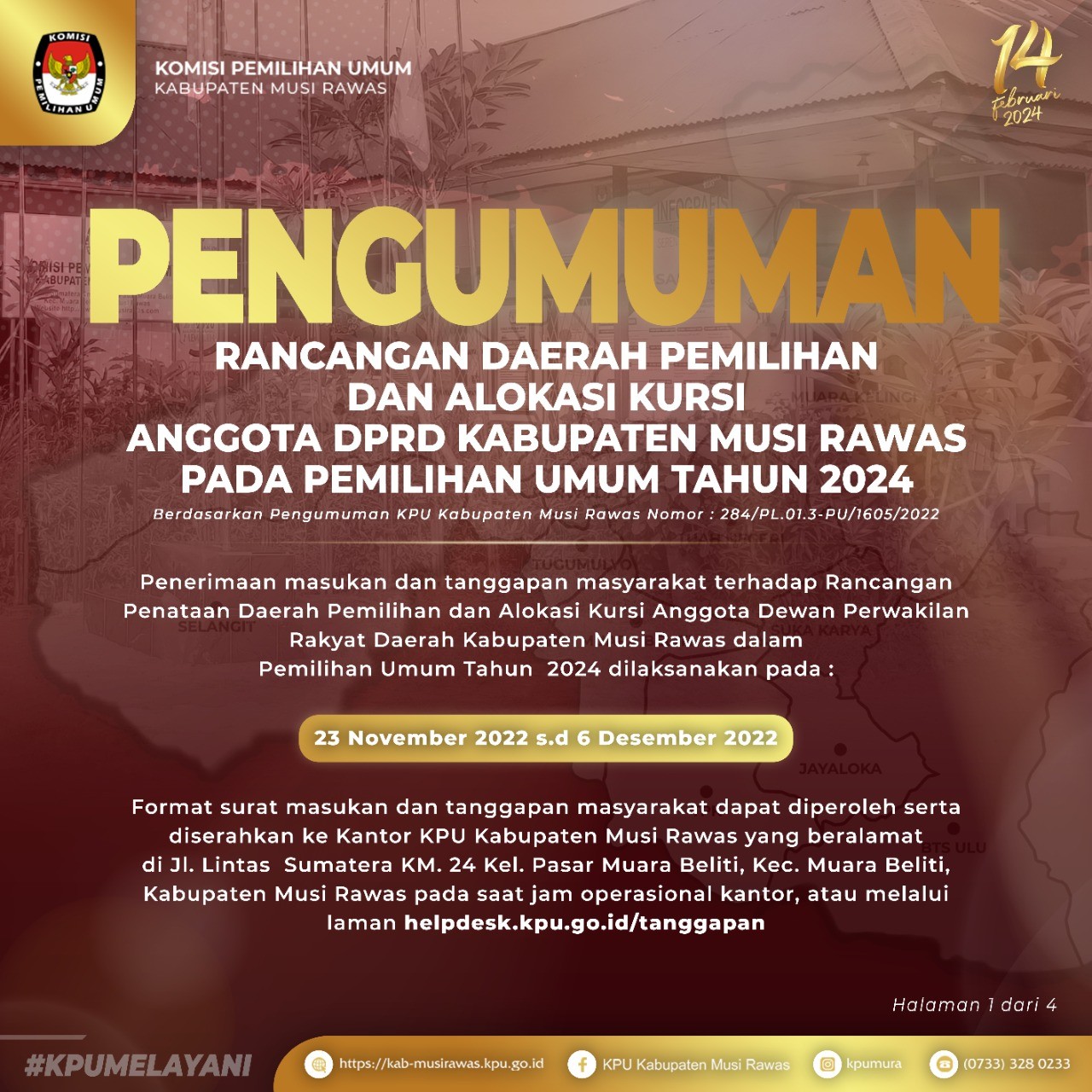 Berdasarkan pada Berita Acara Komisi Pemilihan Umum Kabupaten Musi Rawas Nomor : 76/PL.01.3-BA/1605/2022 tentang Penetapan Rancangan Penataan Daerah Pemilihan dan Alokasi Kursi Anggota Dewan Perwakilan Rakyat Daerah Kabupaten/Kota dalam Pemilihan Umum Tahun 2024 dengan ini mengumumkan Rancangan Penataan Daerah Pemilihan dan Alokasi Kursi Anggota Dewan Perwakilan Rakyat Daerah Kabupaten Musi Rawas dalam Pemilihan Umum Tahun 2024 untuk mendapatkan masukan dan tanggapan masyarakat sebagaimana tercantum dalam lampiran pengumuman di link berikut...