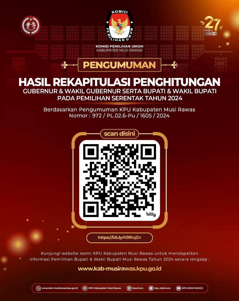 #TemanPemilih, berikut kami informasikan Pengumuman KPU Kabupaten Musi Rawas Nomor : 972/PL/02.6-Pu/1605/2024 Tentang Hasil Rekapitulasi Penghitungan Gubernur & Wakil Gubernur serta Bupati & Wakil Bupati Pada Pemilihan Serentak Tahun 2024 Berdasarkan Rapat Pleno Terbuka Penghitungan dan Penetepan Peroleha Suara Gubernur & Wakil Gubernur serta Bupati & Wakil Bupati Pada Pemilihan Serentak Tahun 2024 Tingkat Kabupaten Musi Rawas ..