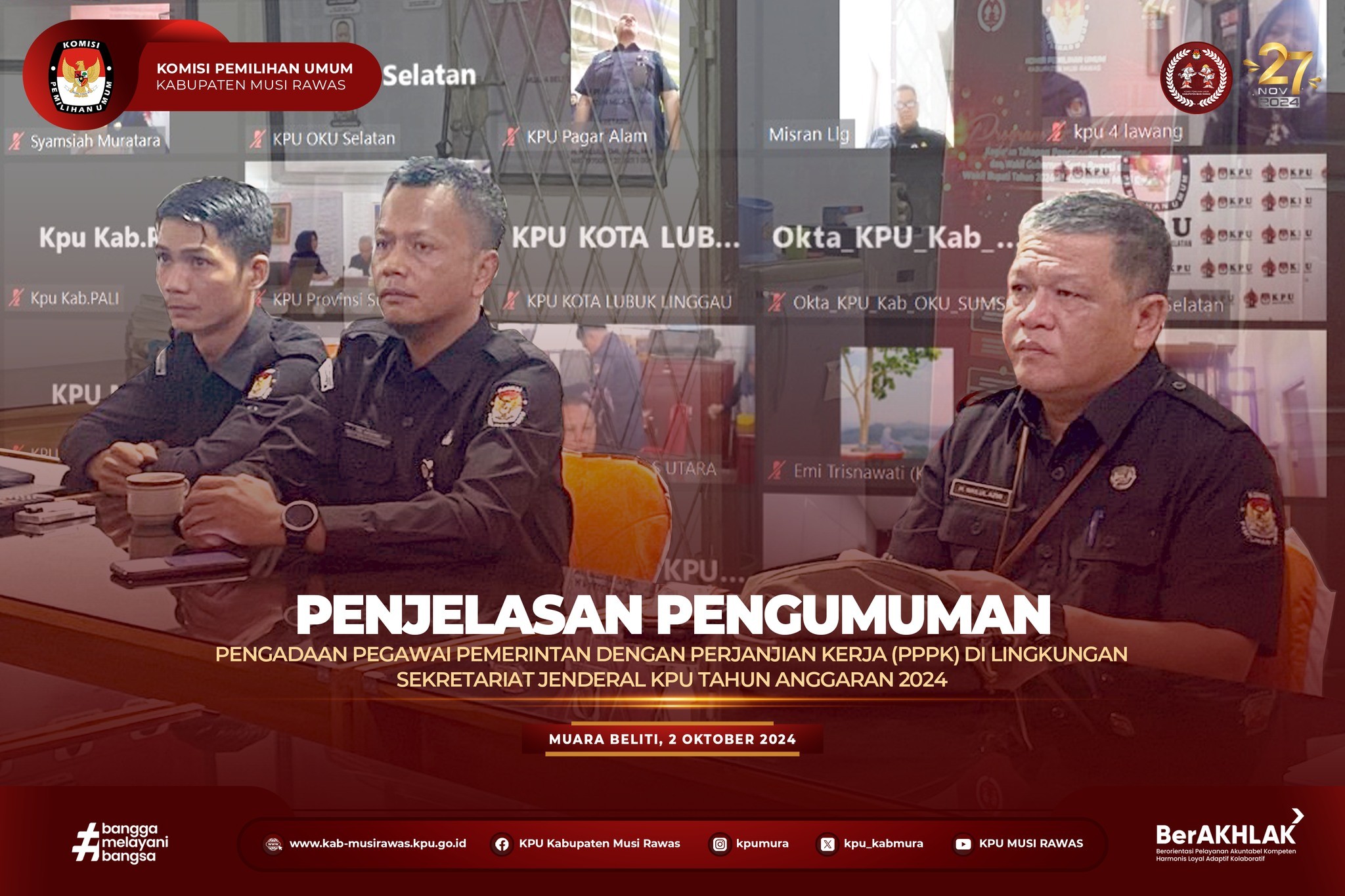 #TemanPemilih, Sekretariat KPU Kabupaten Musi Rawas mengikuti Penjelasan Pengumuman Pengadaan PPPK di Lingkungan Sekretariat Jenderal KPU Tahun Anggaran 2024 secara daring di Kantor Sekretariat KPU Kabupaten Musi Rawas (2/10/2024) ..