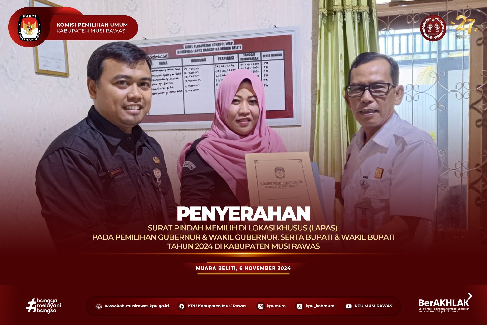 #TemanPemilih, KPU Kabupaten Musi Rawas Melakukan Penyerahan Surat Pindah Memilih di Lokasi Khusus (Lapas) Untuk Pemilihan Gubernur & Wakil Gubernur serta Bupati & Wakil Bupati Tahun 2024 (6/11/2024) ..
