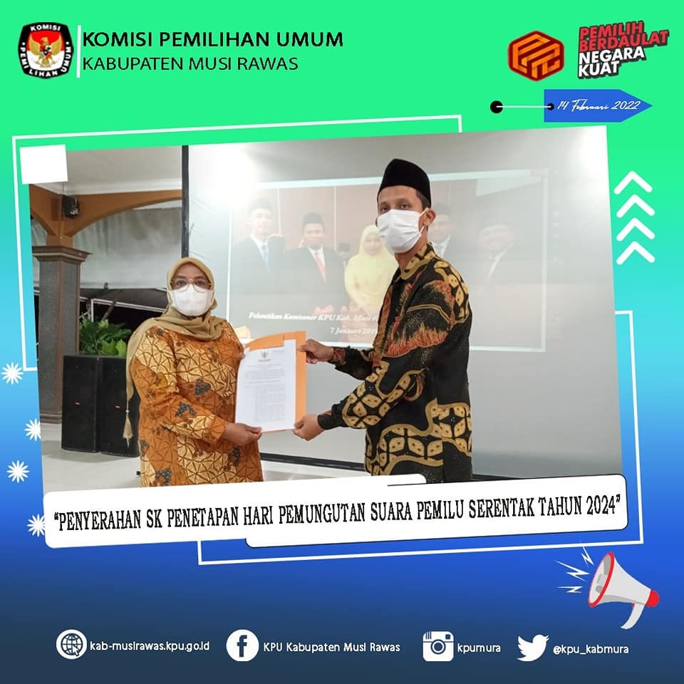 Setelah selesai acara nonton bareng "Peluncuran Hari Pemungutan Suara Pemilu Serentak Tahun 2024", KPU Kabupaten Musi Rawas menyerahkan Surat Keputusan Penetapan Hari Pemungutan Suara Pemilu Serentak Tahun 2024 secara simbolik antara pihak KPU Kabupaten Musi Rawas dengan Pemerintah Kabupaten Musi Rawas. KPU Kabupaten Musi Rawas diwakili oleh Bapak Anasta Tias, S.E. sedangkan Pemerintah Kabupaten Musi Rawas diwakili oleh Wakil Bupati Musi Rawas, Ibu Hj. Suwarti, S.I.P..