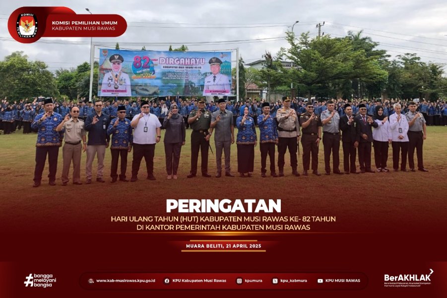 #TemanPemilih, Ketua KPU Kabupaten Musi Rawas, Ibu Ania Trisna AD, SH., MH menghadiri peringatan Hari Ulang Tahun Kabupaten Musi Rawas Ke- 82 Tahun di Kantor Pemerintah Kabupaten Musi Rawas (21/4/2025) ..