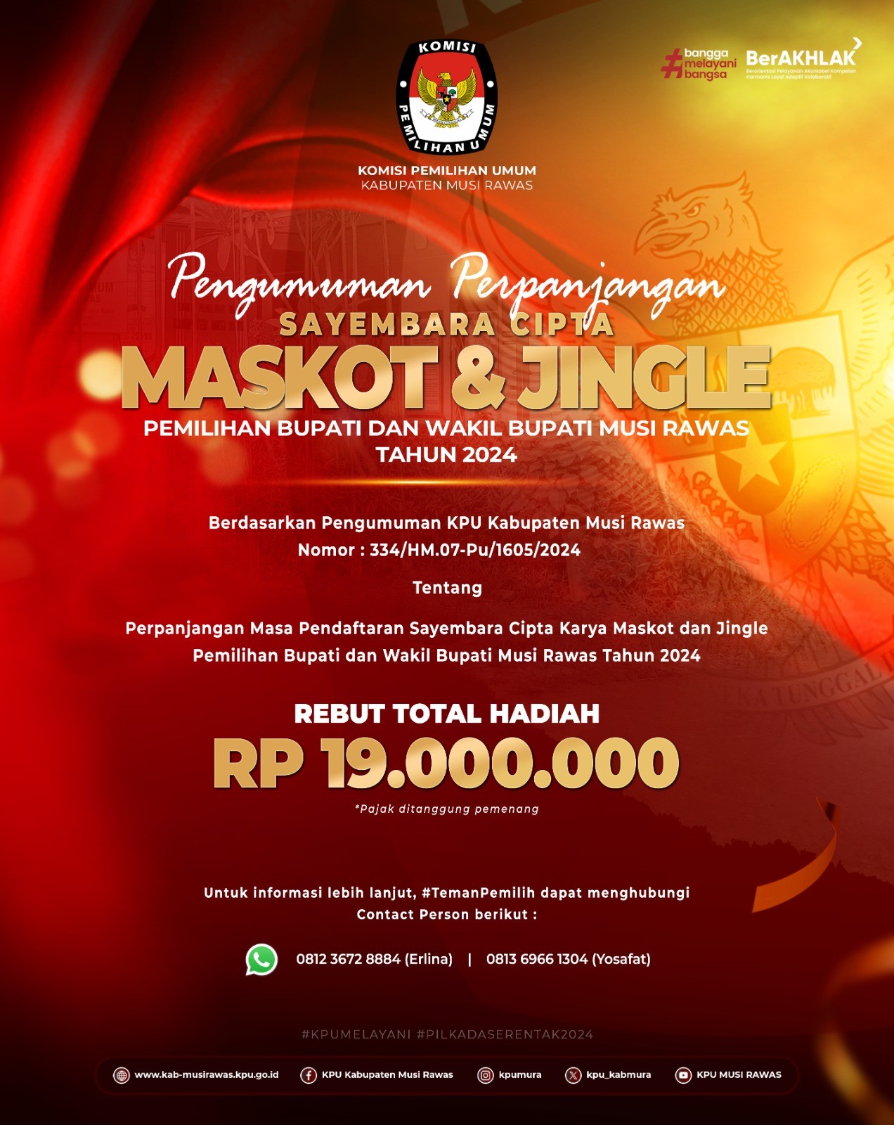 #TemanPemilih, Berikut kami sampaikan perpanjangan masa pendaftaran Sayembara Cipta Maskot dan Jingle Pemilihan Bupati dan Wakil Bupati Musi Rawas Tahun 2024 diperpanjang sampai dengan tanggal 8 Mei 2024.