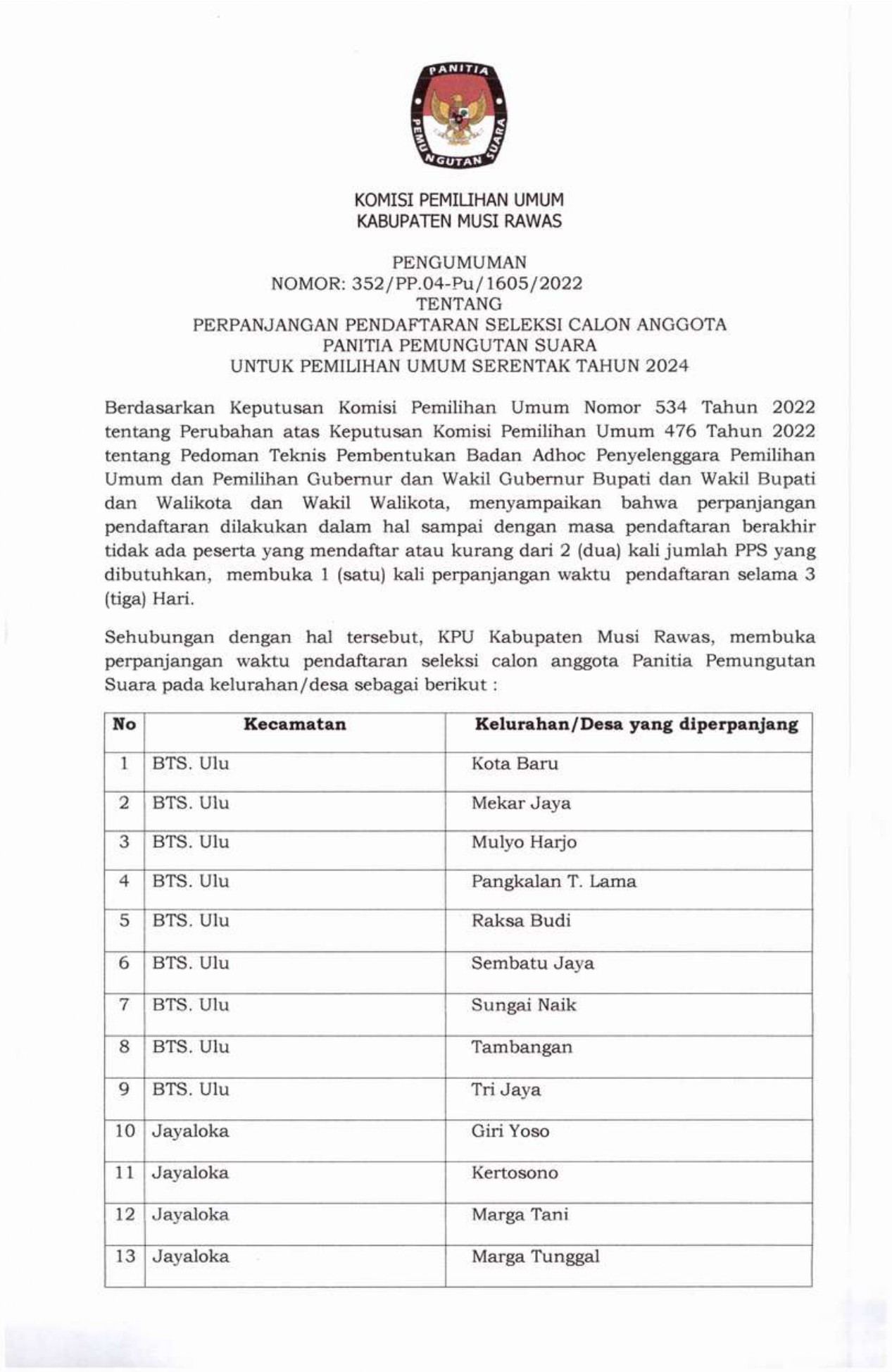 Berhubungan sampai dengan masa pendaftaran berakhir tidak ada peserta yang mendaftar atau jumlah pendaftar kurang dari 2 (dua) kali jumlah Panitia Pemungutan Suara (PPS) yang dibutuhkan, maka KPU Kabupaten Musi Rawas membuka I (satu) kali perpanjangan waktu pendaftaran selama 3 (tiga) hari untuk Desa/Kelurahan yang dimaksud .. .