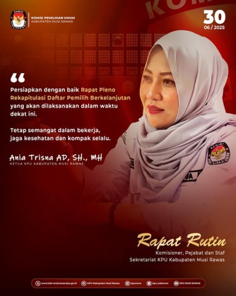 #TemanPemilih, pada Rapat Rutin Komisioner dan Sekretariat KPU Kabupaten Musi Rawas (30/6/2025), Ketua KPU Kabubpaten Musi Rawas, Ibu Ania Trisna AD, SH., MH menyampaikan untuk mempersiapkan Rapat Pleno Rekapitulasi Daftar Pemilih Berkelanjutan dengan sebaik-baiknya ..
