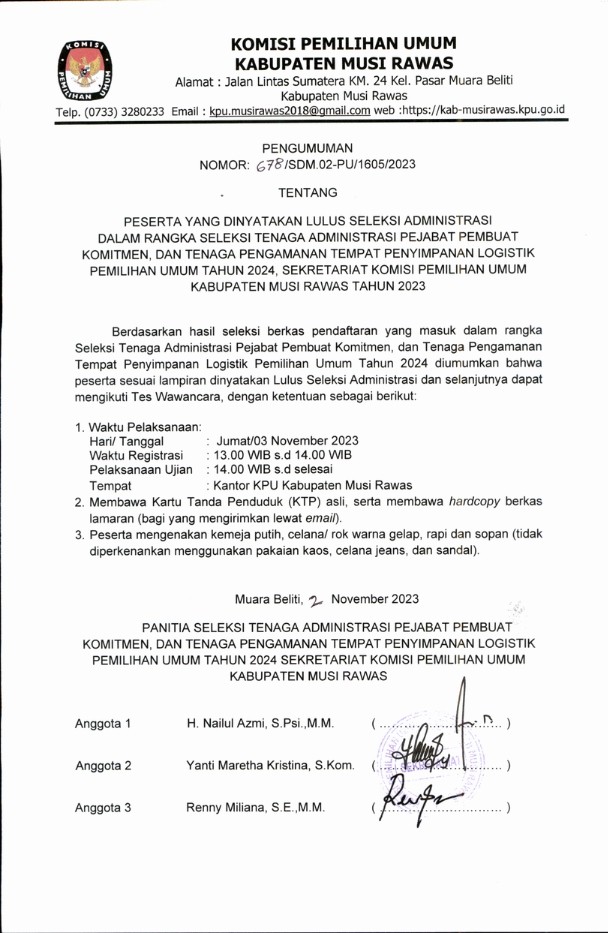 Berikut kami sampaikan pengumuman peserta yang lulus seleksi administrasi dalam rangka seleksi Tenaga Administrasi PPK dan Tenaga Pengamanan Tempat Penyimpanan Logistik pada Pemilihan Umum Tahun 2024. Peserta yang dinyatakan "lulus" selanjutnya akan mengikuti tahapan Tes Wawancara. Untuk informasi lebih lengkapnya, silahkan klik link dibawah ini.