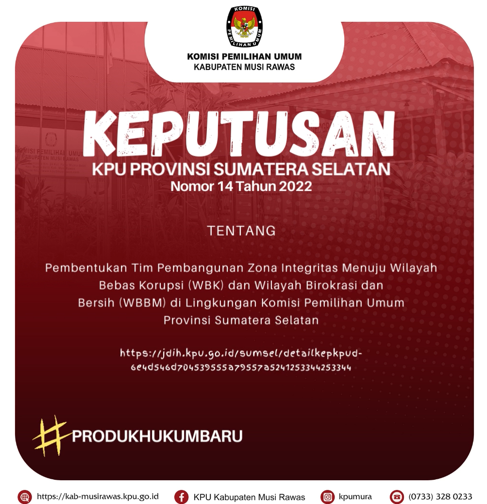 Berikut Keputusan KPU Provinsi Sumatera Selatan Nomor 14 Tahun 2022 tentang "Pembentukan Tim Pembangunan Zona Integritas menuju WBK dan WBBM di lingkungan KPU Prov. Sumsel..