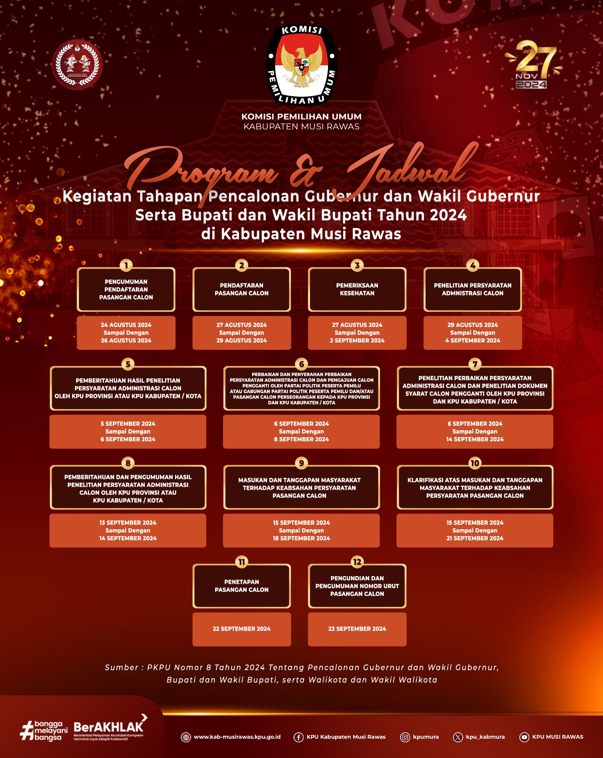#TemanPemilih, berikut kami sampaikan Program dan Jadwal Kegiatan Tahapan Pencalonan Gubernur dan Wakil Gubernur serta Bupati dan Wakil Bupati di Kabupaten Musi Rawas Tahun 2024 . ..