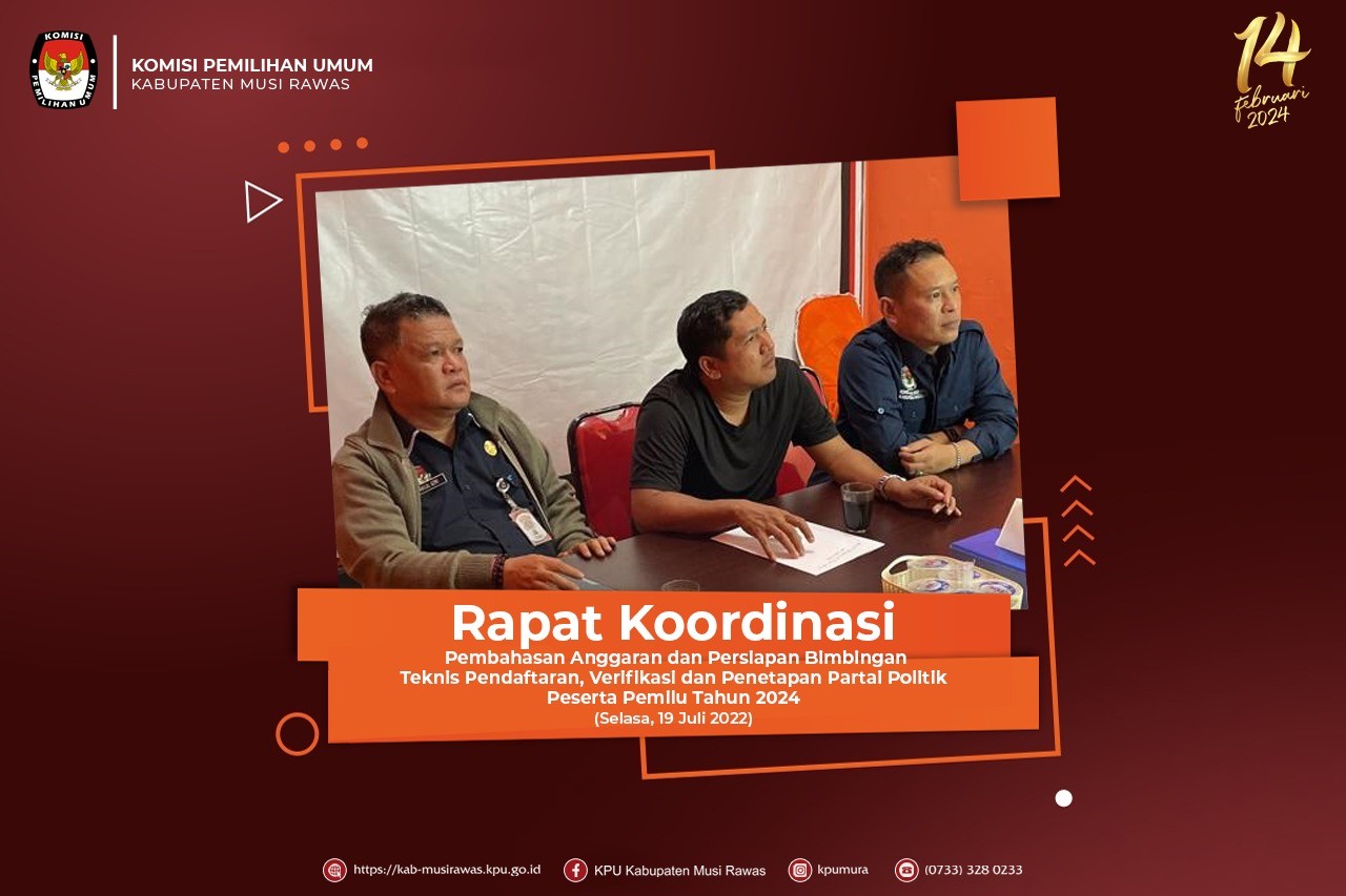 Selasa (19/07), KPU Kabupaten Musi Rawas mengikuti kegiatan Rapat Koordinasi Pembahasan Anggaran dan Persiapan Bimbingan Teknis Pendaftaran, Verifikasi dan Penetapan Partai Politik Peserta Pemilu Tahun 2024. Kegiatan diikuti oleh Bapak Apandi, S.E.,M.M. (Anggota KPU Musi Rawas Divisi Teknis Penyelenggara), Bapak H. Nailul Azmi, S.Psi.,M.M. (Sekretaris KPU Kabupaten Musi Rawas) dan Bapak Junaidi (Bendahara KPU Kabupaten Musi Rawas).
