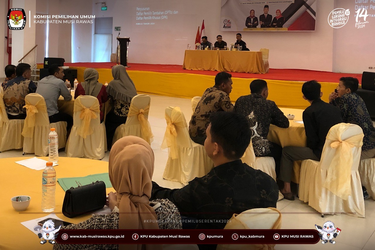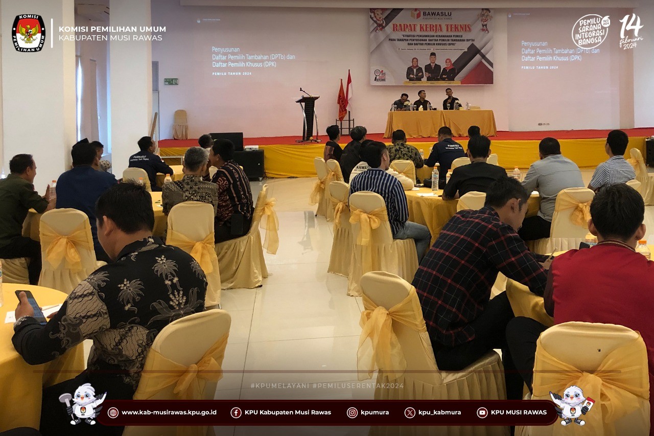 #TemanPemilih, KPU Kabupaten Musi Rawas menghadiri dan menjadi narasumber pada Kegiatan Rapat Kerja Teknis Strategi Pengawasan dan Kerawanan Pemilu Pada Tahapan Penyusunan Daftar Pemilih Tambahan (DPTb) dan Daftar Pemilih Khusus (DPK) yang berlangsung di Hotel Dewinda (11/10/2023) ..