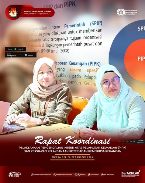 #TemanPemilih, KPU Kabupaten Musi Rawas mengikuti Rapat Koordinasi Pelaksanaan Pengendalian Intern atas Pelaporan Keuangan (PIPK) dan Persiapan Pelaksanaan PDTT BPK Se-Provinsi Sumatera Selatan secara daring di Kantor KPU Kabupaten Musi Rawas (21/8/2025) ..