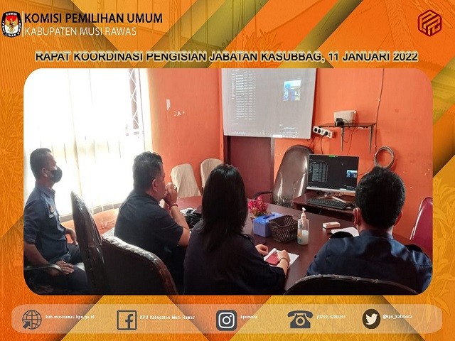 KPU Kabupaten Musi Rawas mengikuti Rapat Koordinasi Jabatan Kasubbag secara daring pada Hari Selasa, 11 Januari 2022. Rapat diikuti oleh Sekretaris KPU Kabupaten Musi Rawas, Bapak H. Nailul Azmi,S.Psi.,M.M.,Sub Koordinator Bagian Hukum dan SDM KPU Kabupaten Musi Rawas, Bapak Andriansah, S.H. beserta staf.